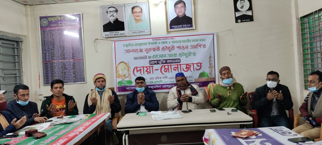 তজুমদ্দিন প্রতিনিধি : ভোলা- ৩ আসনের সংসদ সদস্য আলহাজ্ব নুরুন্নবী চৌধুরী শাওন এর মাতা হোসনেয়ারা চৌধুরীর আশু রোগ মুক্তি কামনা করে দোয়া ও মোনাজাত অনুষ্ঠিত হয়েছে। তজুমদ্দিন প্রেসক্লাবের আয়োজনে মঙ্গলবার মাগরিব বাদ প্রেসক্লাব সভাপতি রফিক সাদীর সভাপতিত্বে হলরুমে দোয়া ও মুনাজাত পরিচালনা করেন প্রেসক্লাবের সাবেক সভাপতি মাওলানা আবদুল জলিল। এসময় উপস্থিত ছিলেন চাঁদপুর ইউপি চেয়ারম্যান শহিদুল্যাহ কিরন, প্রেসক্লাবের সাবেক সভাপতি অধ্যক্ষ হেলাল উদ্দিন সুমন, সাধারণ স¤পাদক এম নূরন্নবী, সহ-সভাপতি মোঃ ফারুক, শরীফ আল-আমিন, সাংগঠনিক স¤পাদক সেলিম রেজা, এম এ হালিম, যুগ্ন সাধারণ স¤পাদক মনির নয়ন, প্রচার ও দপ্তর স¤পাদক মোঃ মোশারেফ, সাবেক সাধারণ স¤পাদক তরুন দাস, সদস্য সাদির হোসেন রাহিম, ফারহানুর রহমান সময়, মোঃ মামুন, রুবেল চক্রবর্তী, ইলিয়াস সানি, মোঃ শাকিব প্রমুখ।