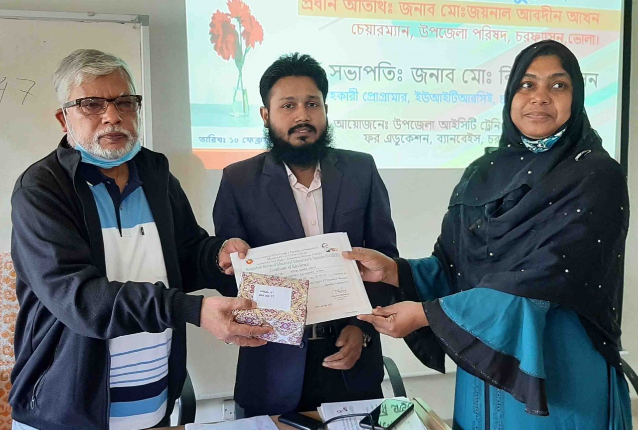 এআর সোহেব চৌধুরী, চরফ্যাশন : আইসিটি ট্রেনিং এন্ড রিসোর্স সেন্টার ফর এডুকেশন (ব্যানবেইস) চরফ্যাশন উপজেলা কর্তৃক বিভিন্ন শিক্ষাপ্রতিষ্ঠানের ১১টি ব্যাচে ২৬৪ জন শিক্ষক শিক্ষিকাকে অনলাইন টিচিং এন্ড লাইভ ক্লাস ম্যানেজমেন্টসহ ব্যাসিক প্রোগ্রাম প্রশিক্ষণ প্রদাণ করা হয়েছে। ৬দিন ব্যাপী এ প্রশিক্ষণের বৃহস্পতিবার (১০ফেব্রুয়ারী) বিকেলে সমাপনী অনুষ্ঠিত হয়েছে। অনুষ্ঠানে প্রধান অতিথি হিসেবে উপস্থিত ছিলেন, উপজেলা চেয়ারম্যান জয়নাল আবেদিন আখন,বিশেষ অতিথি হিসেবে উপস্থিত ছিলেন, উপজেলা সহকারী কমিশনার (ভূমি) আবু আবদুল্লাহ খান। এ প্রশিক্ষণ প্রদানে মাস্টার ট্রেইনার হিসেবে ছিলেন, ব্যানবেইস সহকারী প্রোগ্রামার বিল্লাল হোসেন,সরকারি টি.ব্যারেট মাধ্যমিক বিদ্যালয়ের সহকারী প্রধান শিক্ষিকা তছলিমা বেগম,অধ্যক্ষ্য নজরুল ইসলাম ডিগ্রি কলেজের প্রভাষক ইকবাল হোসেন ও চরফ্যাশন বালিকা মাধ্যমিক বিদ্যালয়ের সহকারী শিক্ষক মো. ফরিদ উদ্দিন প্রমুখ। সমাপনী অনুষ্ঠানে প্রথম ও দ্বিতীয় এবং তৃতিয় স্থান অর্জনকারীদের পুরুস্কার বিতরণসহ সনদ তুলে দেন অতিথিরা।