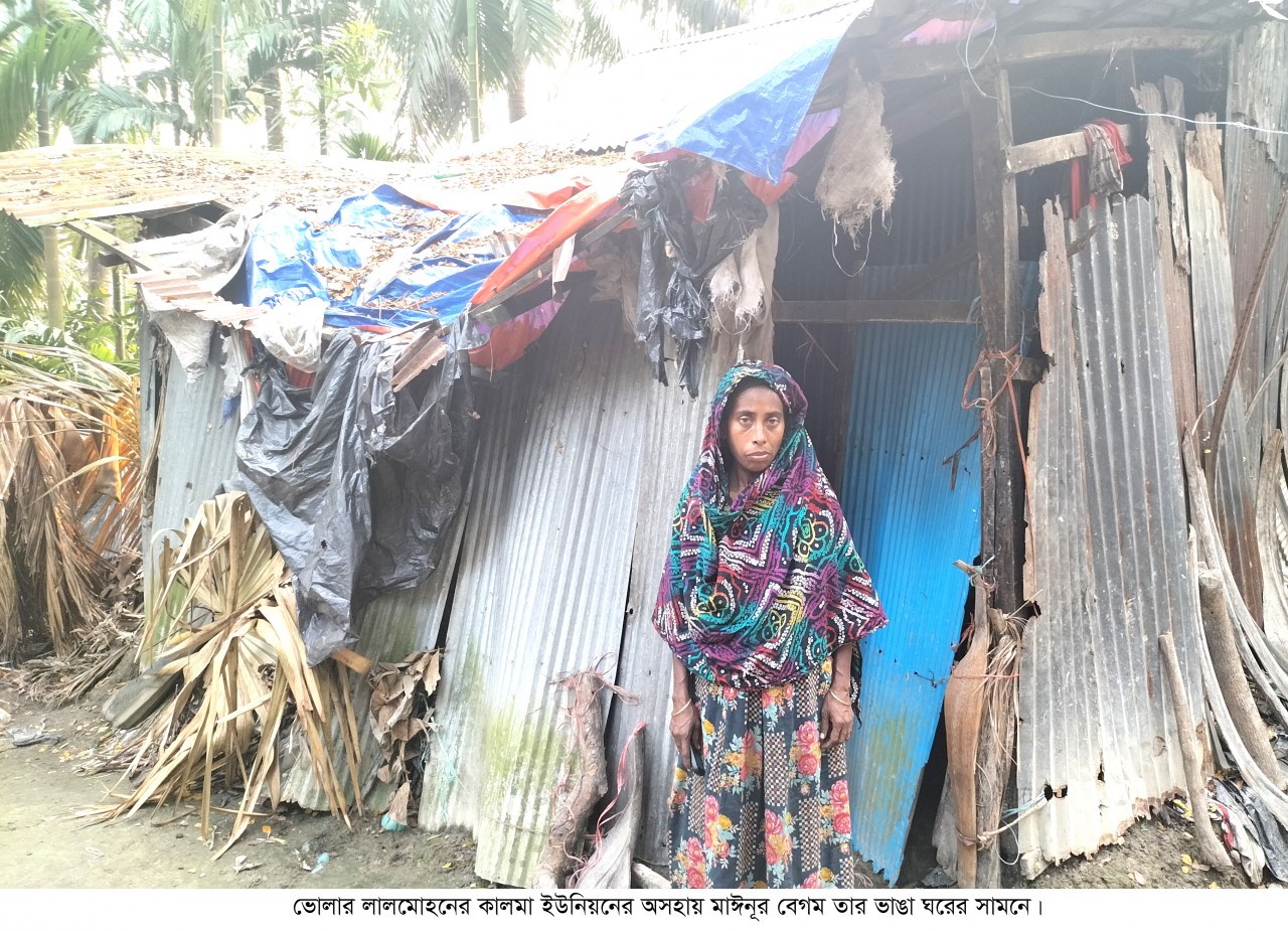 লালমোহন প্রতিনিধি : মাঈনূর বেগম। বয়স ৪০। লিভার ক্যান্সারে আক্রান্ত হয়ে মাইনূরের স্বামী মারা গেছেন প্রায় ১২ বছর আগে। তখন থাকতেন পটুয়াখালীর রাঙাবালিতে। স্বামীর মৃত্যুর কয়েক বছর পর তার বাবা প্রায় ৮ বছর আগে ভোলার লালমোহন উপজেলার কালমা ইউনিয়নের ৬ নং ওয়ার্ডের হাশেম চকিদার বাড়ি এলাকায় ৩ শতাংশ জমি কিনে দেন। জমি কেনার পরে মারা যান মাঈনূরের বাবাও। পরে ওই জমিতে এলাকাবাসীর সহযোগিতা নিয়ে ঘর তুলেন মাঈনূর বেগম। বাস করছেন বৃদ্ধ মা আর এক মেয়েকে নিয়ে। বিগত কয়েক বছর ধরে মাথা গোঁজার একমাত্র বসত ঘরটি ঝরাঝীর্ণ হয়ে রয়েছে। বৃষ্টি আসলেই পানি পড়ে ঘরের মধ্যে। তখন অন্যের ঘরে গিয়ে আশ্রয় নিতে হয় মাঈনূরকে। প্রতিবেশীদের সহযোগিতা আর এলজিইডির আরইআরএমপি প্রকল্পে কাজ করে সংসার চলে তার। তবুও তিন বেলা খাবার জোটানো দায় মাঈনূরের। সংসারে এত-ই অভাব; চতুর্থ শ্রেণি পর্যন্ত পড়ার পর একমাত্র মেয়েটিকে অর্থের অভাবে পঞ্চম শ্রেণিতেও পারাতে পারেনি মাঈনূর বেগম।