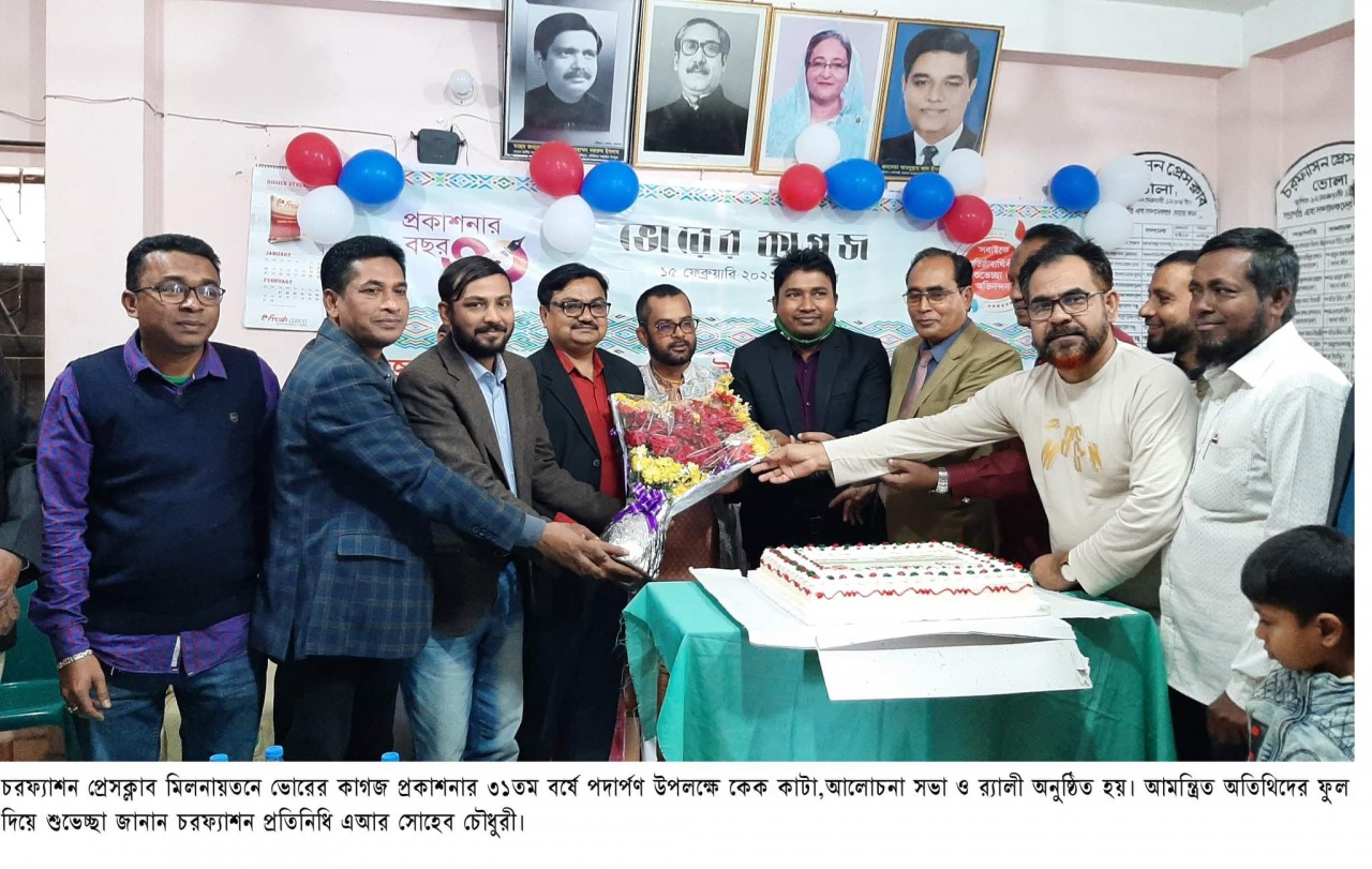নয়ন,ক্রীড়া স¤পাদক মাহবুবুর রহমান নাজমুল,সাহিত্য স¤পাদক সাইফুল ইসলাম মুকুল,সদস্য এম লোকমান হোসেন ও নুরুল্লাহ ভ‚ইয়া প্রমুখ। অনুষ্ঠানে ভোরের কাগজ চরফ্যাশন প্রতিনিধি এআর সোহেব চৌধুরীর সভাপতিত্বে বক্তারা বলেন,প্রিন্ট মিডিয়াকে টিকিয়ে রাখা এখন চ্যালেঞ্জ হয়ে দাঁড়িয়েছে। মহান মুক্তিযুদ্ধ ও অসা¤প্রদায়িক চেতনাকে ধারণ করে ভোরের কাগজের যাত্রা শুরু হয়। আর এ চেতনাকে লালন করে দেশ ও দেশের মানুষের অধিকার নিয়ে কথা বলে ভোরের কাগজ। যার ফলে এ পত্রিকাটি অন্যায় অবিচারের সঙ্গে আপসহীন অবস্থানে থেকে দেশের স্বার্থ ও সমৃদ্ধিও পক্ষে সুদৃঢ়ভাবে কাজ করায় পাঠকের কাছে ভোরের কাগজ এখনো স্বগৌরবে আলাদা মর্যাদায় রয়েছে। অবিচল সংগ্রাম করে দীর্ঘ পথচলায় পত্রিকাটির স¤পাদক শ্যামল দত্তের ভ‚মিকা ও পত্রিকাটির সকল সহযোগী কর্মকর্তাদের প্রশংসা করেন আমন্ত্রীত অতিথিরা। আলোচনা শেষে বেলা ১১টায় চরফ্যাশন কলেজ রোডে র্যালীতে অংশগ্রহণ করেন তাঁরা।