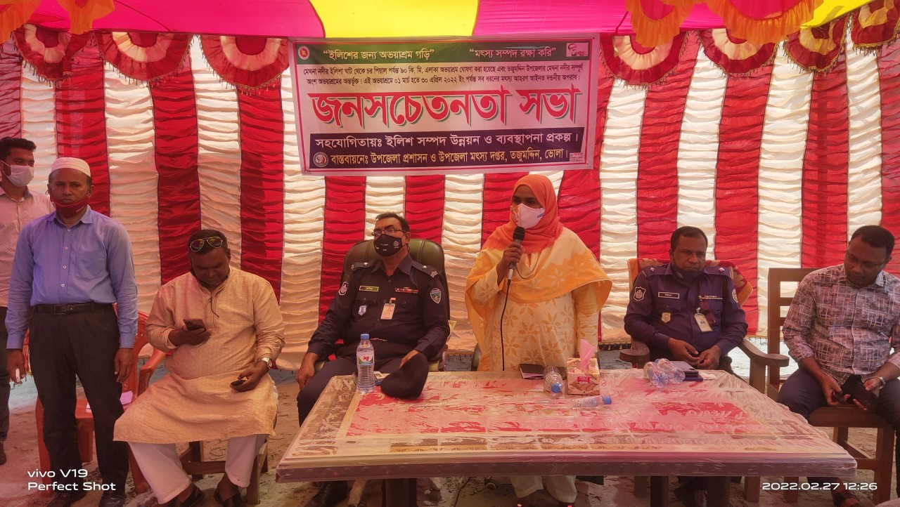 মৎস্য অফিসার আমির হোসেন জানান, সরকার প্রজ্ঞাপনের মাধ্যমে প্রতিবছর ১ লা মার্চ থেকে ৩০ এপ্রিল মেঘনা নদীর ইলিশা ঘাট থেকে চর পিয়াল পর্যন্ত ৯০ কিঃ মিঃ এলাকায় অভয়আশ্রম ঘোষনা করে সকল ধরনের মাছ ধরা নিষিদ্ধ করা হয়েছে।উপজেলা মৎস্য অফিসার আমির হোসেনের সভাপতিত্বে জনসচেতনতা সভায় প্রধান অতিথি ছিলেন উপজেলা নির্বাহী অফিসার মরিয়ম বেগম। বিশেষ অতিথি ছিলেন মনপুরা তজুমদ্দিন সার্কেল অফিসার মনিরুল ইসলাম, অফিসার ইন-চার্জ এসএম জিয়াউল হক, চাদঁপুর ইউপি চেয়ারম্যান শহিদুল্লাহ কিরন, সোনাপুর চেয়ারম্যান মেহেদী হাসান মিশু, প্রেসক্লাব সভাপতি মোঃ রফিক সাদী, শশীগঞ্জ আড়ৎদার সমিতির সভাপতি আবুল হাসেম মহাজন, চৌমুহনীর আড়ৎদার মোঃ ফারুক মিয়া প্রমূখ।
