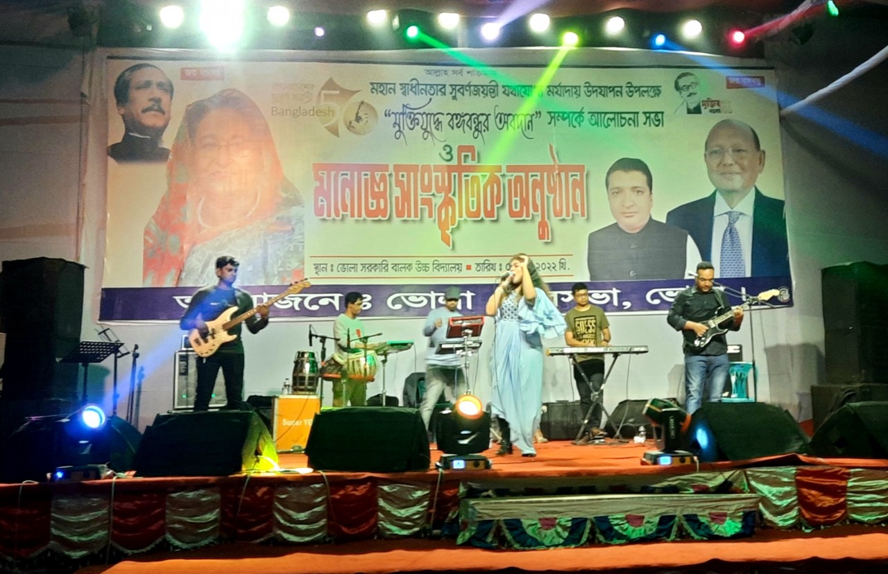 ভোলায় জমকালো আয়োজনে মুক্তিযুদ্ধে বঙ্গবন্ধুর অবদান সম্পর্কে আলোচনা ও মনোজ্ঞ সাংস্কৃতিক অনুষ্ঠান অনিুষ্ঠিত হয়েছে। মহান স্বাধীনতার সুবর্ণজয়ন্তী যথাযথ মর্যাদায় পালন উপলক্ষে ভোলা সরকারি বালক উচ্চ বিদ্যালয় মাঠে ভোলা পৌর সভার আয়োজনে আলোচনা ও মনোজ্ঞ সাংস্কৃতিক অনুষ্ঠান উপভোগ করেন কয়েক হাজার নারী পুরুষ। এ সময় রাতের আকাশে আতোশ বাজীর ঝলকানি ও মঞ্চ মাতিয়ে তুলেন জনপ্রিয় সঙ্গীত শিল্পীরা।