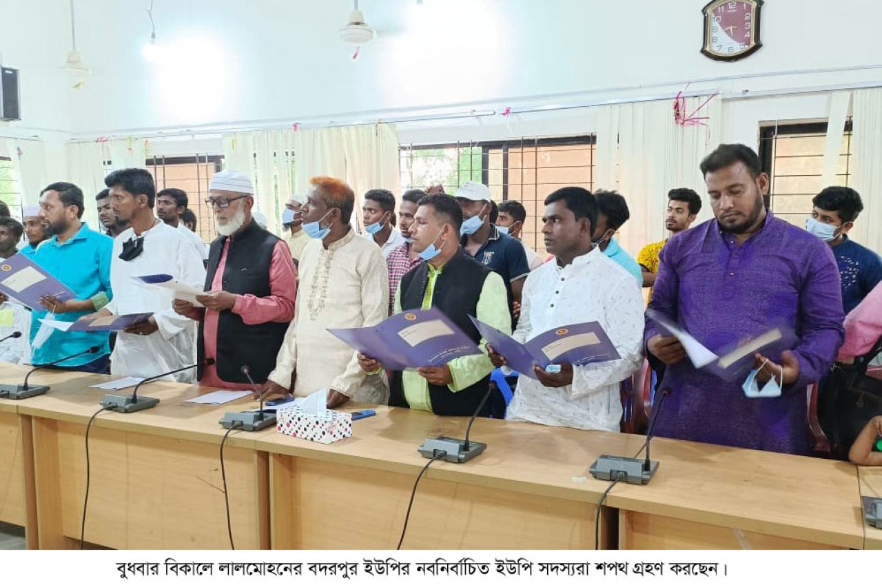 ভোলার লালমোহনের বদরপুর ইউনিয়ন পরিষদের নবনির্বাচিত সদস্যদের শপথ গ্রহণ অনুষ্ঠিত হয়েছে। বুধবার বিকালে উপজেলা প্রশাসনের আয়োজনে উপজেলা পরিষদ হলরুমে এ শপথ গ্রহণ অনুষ্ঠিত হয়। নবনির্বাচিত ইউপি সদস্যদের শপথ বাক্য পাঠ করান উপজেলা নির্বাহী কর্মকর্তা (ইউএনও) পল্লব কুমার হাজরা।