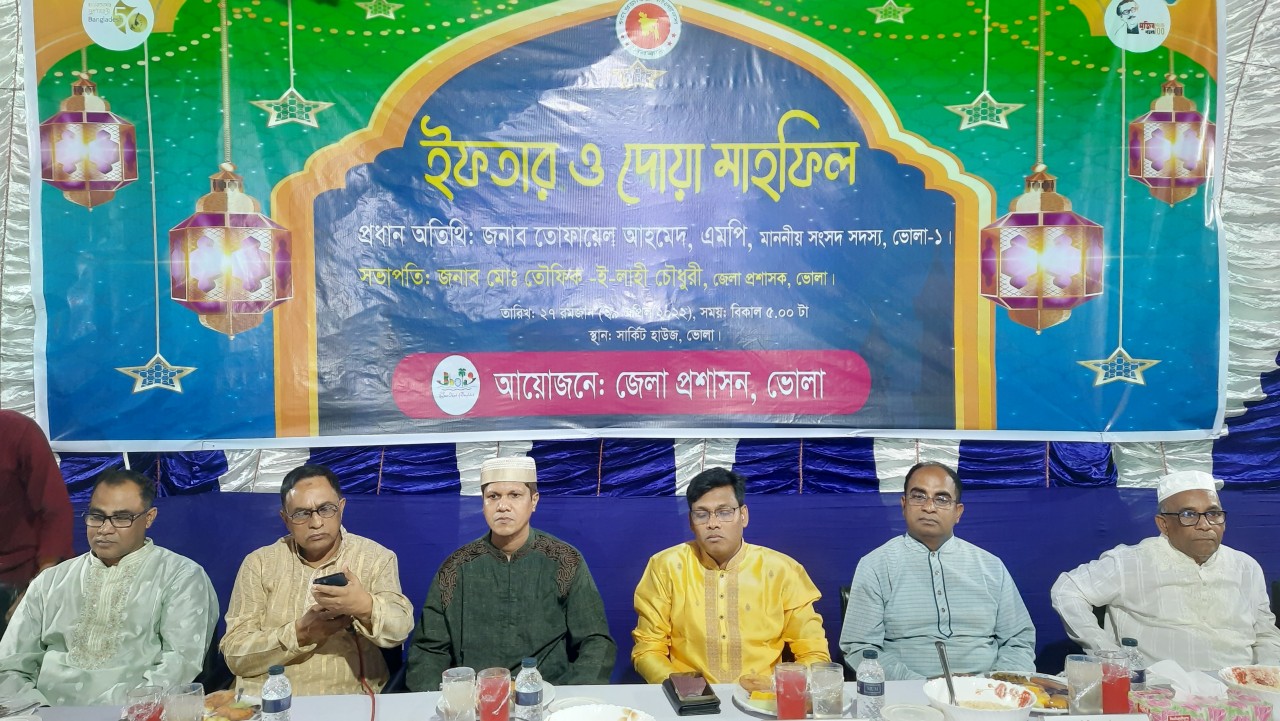 অচিন্ত্য মজুমদার II ভোলা জেলা প্রশাসনের আয়োজনে ভোলায় দোয়া ও ইফতার মাহফিল অনুষ্ঠিত হয়েছে। শুক্রবার সন্ধ্যায় ভোলা সার্কিট হাউজ প্রাঙ্গণে এ দোয়া ও ইফতার মাহফিল অনুষ্ঠিত হয়েছে। দেয়া ও ইফতার মাহফিল অনুষ্ঠানের প্রধান অতিথি ভোলা-১ আসনের সংসদ সদস্য,আওয়ামী লীগের উপদেষ্টা পরিষদের সদস্য ও সাবেক বাণিজ্যমন্ত্রী তোফায়েল আহমেদ ভাচুর্য়ালি বক্তব্য রাখেন। এ সময় সকলকে শুভেচ্ছা জানান তিনি।