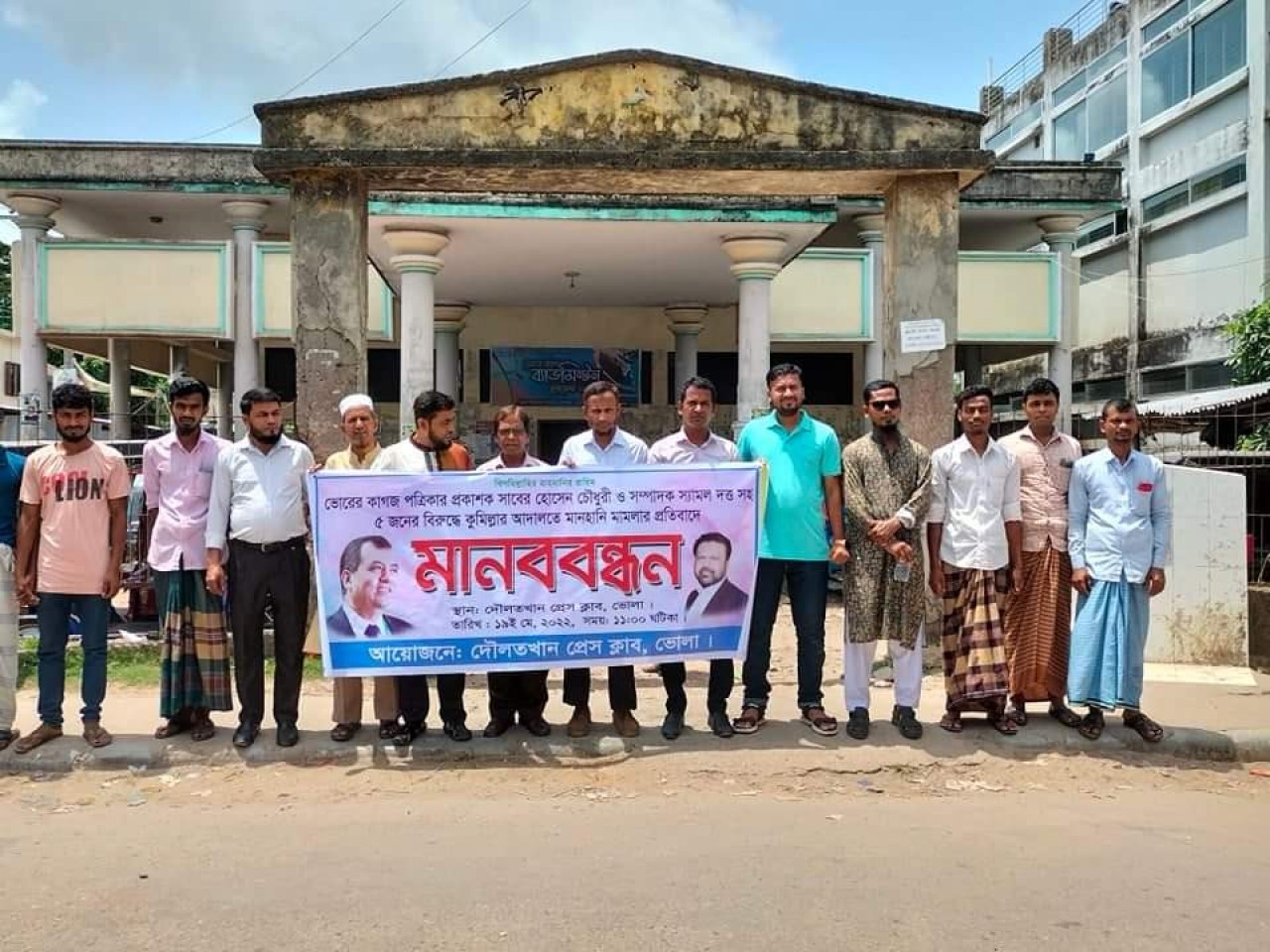 দৌলতখান প্রতিনিধি : দৈনিক ভোরের কাগজের প্রকাশক সাবের হোসেন চৌধুরী, স¤পাদক শ্যামল দত্তসহ পাঁচ সাংবাদিকের বিরুদ্ধে কুমিল্লার আদালতে মানহানিকর মামলা দায়েরের প্রতিবাদে ভোলার দৌলতখানে মানববন্ধন ও প্রতিবাদ সভা অনুষ্ঠিত হয়েছে। বৃহ¯পতিবার (১৯ মে) সকাল ১১টায় দৌলতখান প্রেসক্লাবের উদ্যোগে দৌলতখান পৌর শহরের টাউনহল চত্বরে এ মানববন্ধন অনুষ্ঠিত হয়। পরে দৌলতখান প্রেসক্লাবের হলরুমে অনুষ্ঠিত প্রতিবাদ সভায় স্থানীয় প্রিন্ট ও ইলেকট্রনিক্স মিডিয়ায় কর্মরত সাংবাদিকরা বলেন, বস্তুনিষ্ঠ সংবাদ প্রকাশের পর সাংবাদিকের বিরুদ্ধে মামলা, সাংবাদিকতার জন্য হুমকি । এধরনের হয়রানিমূলক মামলা স্বাধীন সাংবাদিকতার পথে বাধা হয়ে দাঁড়াবে। সুষ্ঠু তদন্তের মাধ্যমে অবিলম্বে মামলা প্রত্যাহারের দাবি জানান সাংবাদিক নেতারা। এসময় দৈনিক যুগান্তর প্রতিনিধি শ.ম ফারুক, দৈনিক ইনকিলাব প্রতিনিধি মোঃ মিজানুর রহমান , দৈনিক মানবজমিন প্রতিনিধি জাকির আলম, দৈনিক ভোরের কাগজ প্রতিনিধি মেহেদী হাসান শরীফ, দৈনিক আমাদের সময় প্রতিনিধি রোমানুল ইসলাম সোহেবসহ গণমাধ্যমকর্মীরা উপস্থিত ছিলেন।