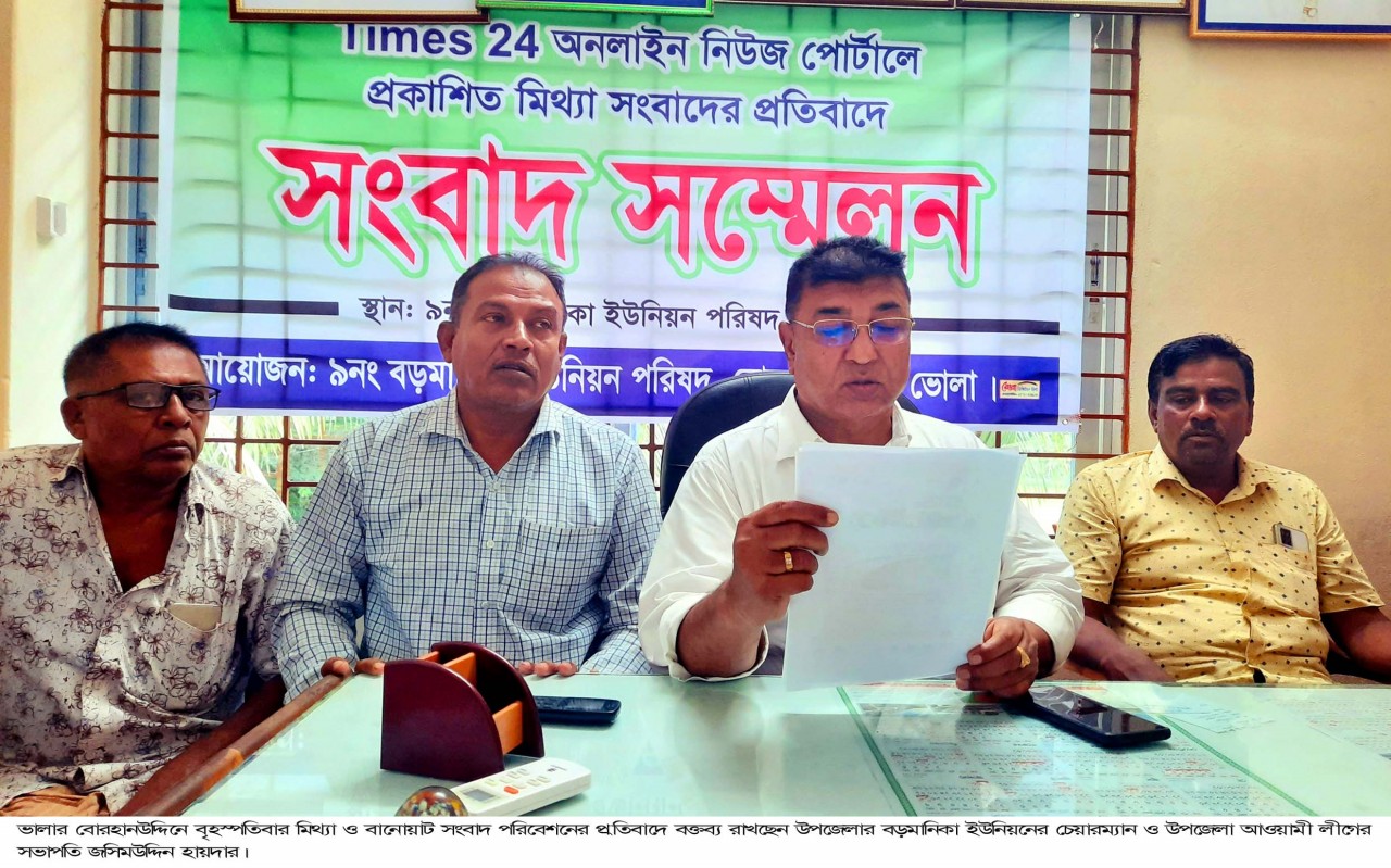ভোলার বোরহানউদ্দিনে একটি অনলাইন ও ইউটিউব ভিত্তিক মিডিয়ায় মিথ্যা ও বানোয়াট সংবাদ পরিবেশনের প্রতিবাদে প্রতিবাদে সংবাদ সম্মেলন করেছেন উপজেলার বড়মানিকা ইউনিয়নের চেয়ারম্যান ও উপজেলা আওয়ামী লীগের সভাপতি জসিমউদ্দিন হায়দার। বৃহস্পতিবার দুপুরে বড়মানিকা ইউনিয়ন পরিষদে বোরহানউদ্দিনে কর্মরত সংবাদকর্মীদের উপস্থিতিতে ওই সংবাদ সম্মেলন অনুষ্ঠিত হয়। লিখিত ও প্রশ্নেত্তরে জসিমউদ্দিন হায়দার জানান, একটি সংবাদভিত্তিক ইউটিউব চ্যানেল টাইমস২৪ ও একটি অনলাইন মিডিয়ার প্রতিনিধির ফেসবুক পেইজে জেলেদের কার্ড থাকা সত্বেও তাঁদের চাল দেয়া হচ্ছেনা বলে অনিয়মের অভিযোগ তোলা হয়।
