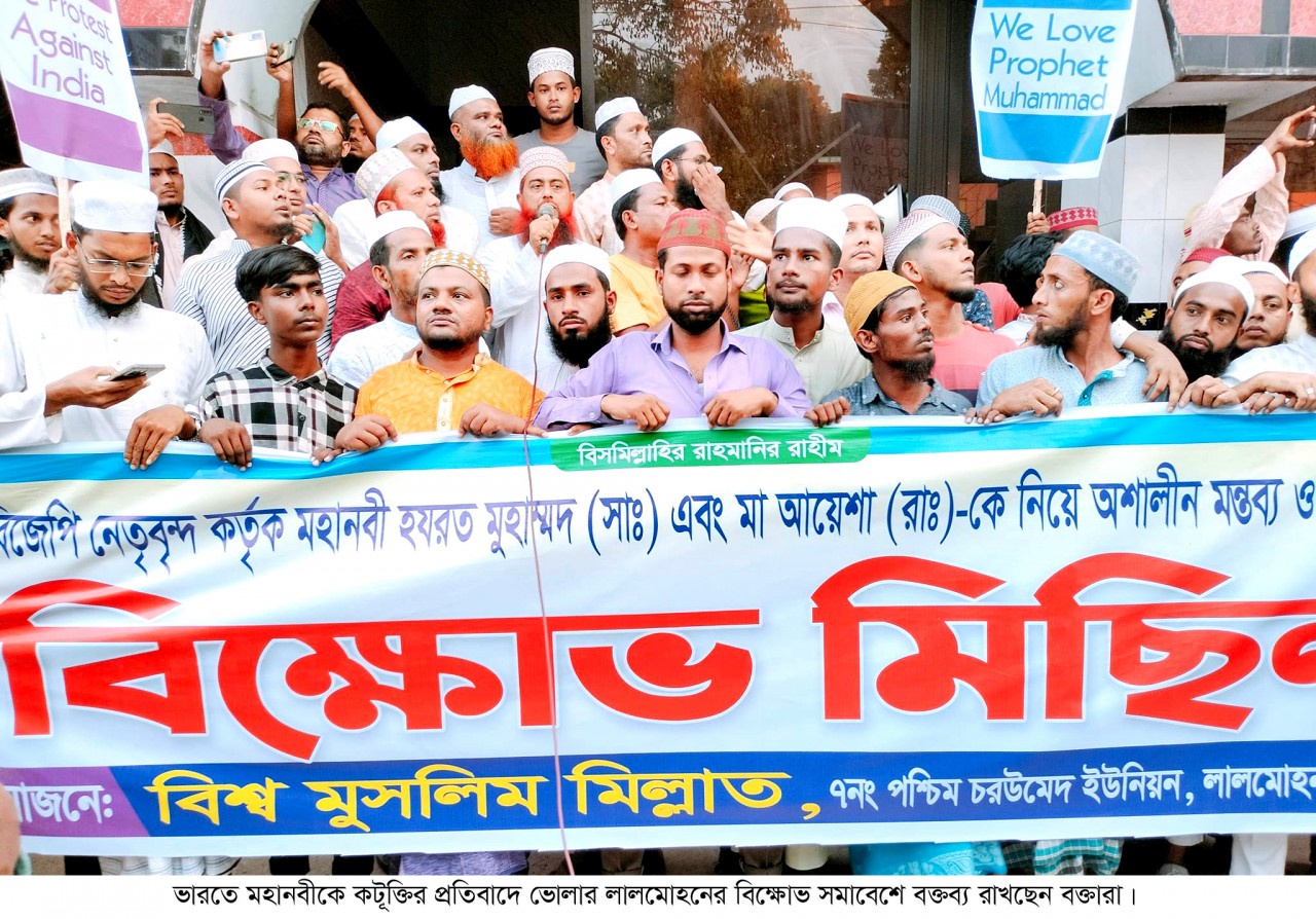 লালমোহন প্রতিনিধি : ভারতে বিজেপি নেতৃবৃন্দ কর্তৃক মহানবী হযরত মুহাম্মদ (সা:) এবং মা আয়েশা (রা:) কে নিয়ে অশালীন মন্তব্য ও কটূক্তির প্রতিবাদে ভোলার লালমোহনের বিক্ষোভ মিছিল করেছে ধর্মপ্রাণ মুসল্লীরা। শুক্রবার বিকালে উপজেলা পশ্চিম চরউমেদ ইউনিয়ন শাখা ‘বিশ^ মুসলিম মিল্লাত’ এর ব্যানারে মুসল্লীরা এ বিক্ষোভ মিছিল করেন। মিছিলটি গজারিয়া ইসলামিয়া ফাজিল ডিগ্রী মাদ্রাসা প্রাঙ্গন থেকে বের হয়ে সদর রোডে এসে শেষ হয়। পরে সেখানে বিক্ষোভ সমাবেশ করেন মুসল্লীরা।