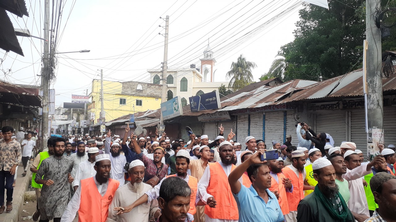 শুক্রবার (১০জুন) জুমার নামাজের পর শহরের হাটখোলা জামে মসজিদ চত্বরে প্রতিবাদ সভা করেন। এসময় শহরের বিভিন্ন মসজিদ থেকে মিছিল নিয়ে হাজার হাজার মুসল্লীরা সভাস্থলে উপস্থিত হয়। সভা শেষে শহরে একটি বিক্ষোভ মিছিল বের করে তারা। মিছিলটি শহরের গুরুত্বপূর্ণ সড়ক প্রদক্ষিণ করে শহরের বরিশাল দালানের সামনে গিয়ে শেষ হয়।