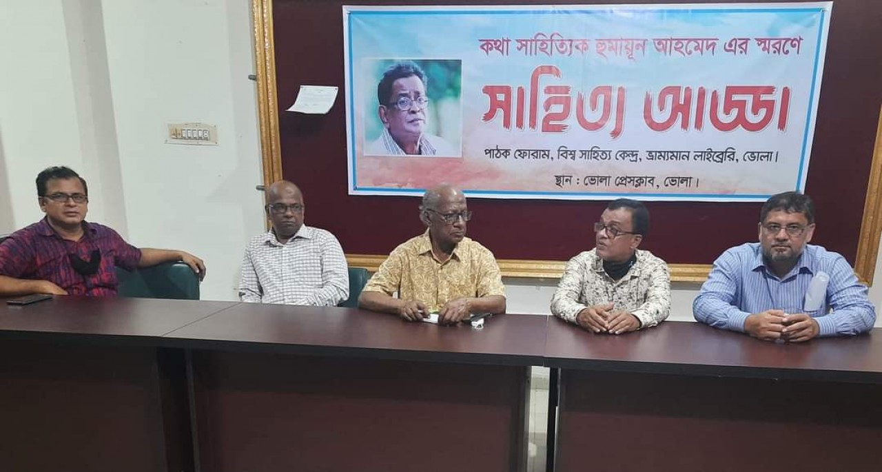 বাংলার কণ্ঠ প্রতিবেদক: বাংলা ভাষা ও সাহিত্যের বিশিষ্ট কথা সাহিত্যিক হুমায়ূন আহমেদ এর ১০ মৃত্যু বার্ষিকী উপলক্ষে ভোলা প্রেসক্লাবে সাহিত্য আড্ডা অনুষ্ঠিত হয়েছে। বিশ্ব সাহিত্য কেন্দ্রের ভ্রাম্যমান লাইব্রেরি ভোলার পাঠক ফোরাম আয়োজিত সাহিত্য আড্ডায় সভাপতিত্ব করেন প্রেসক্লাব সভাপতি এম হাবিবুর রহমান। আড্ডার মধ্যমনি ছিলেন নাজিউর রহমান কলেজের ভাইস প্রিন্সিপাল কবি পীযুষ কান্তি হালদার। বিশেষ অতিথি ছিলেন অধ্যক্ষ মাজহারুল ইসলাম, বিশিষ্ট সংগীতশিল্পী মনির চৌধুরী।