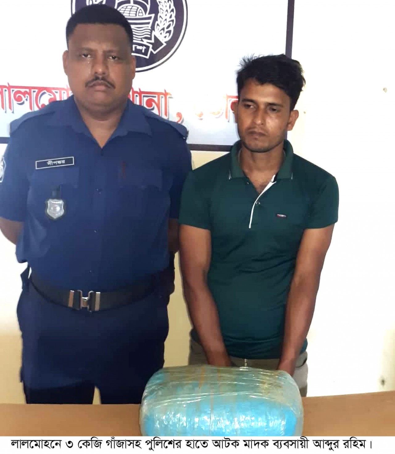 লালমোহন প্রতিনিধি : ভোলার লালমোহনে ৩ কেজি গাঁজাসহ আব্দুর রহিম (২৮) নামের এক মাদক ব্যবসায়ীকে আটক করেছে পুলিশ। বৃহস্পতিবার সকালে গোপন সংবাদের ভিত্তিতে অভিযান চালিয়ে উপজেলার রমাগঞ্জ ইউনিয়নের হাফিজ উদ্দিন বাজার এলাকা থেকে তাকে আটক করা হয়। আটককৃত রহিম ওই এলাকার মো. মোফাজ্জলের ছেলে।