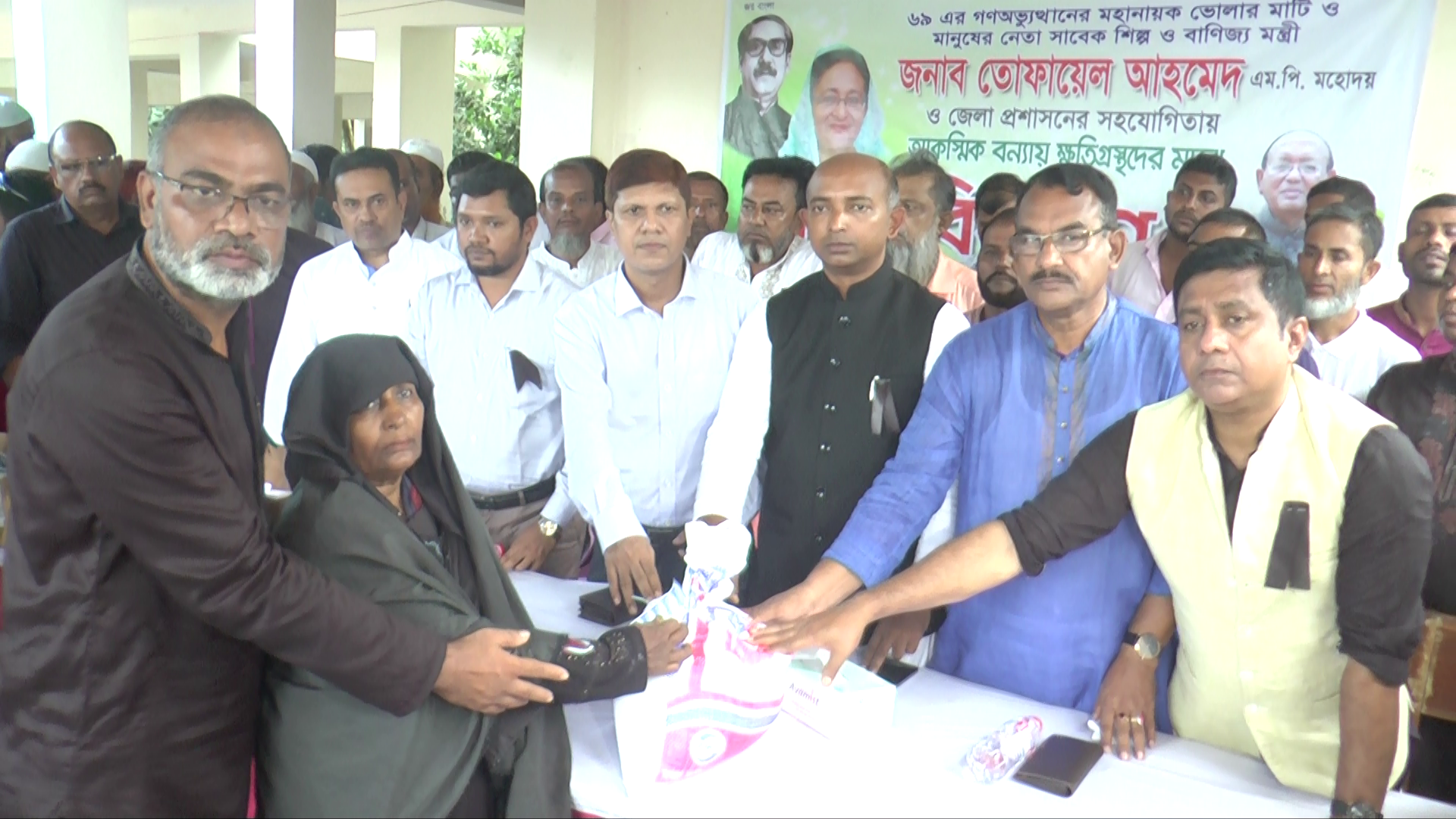 বাংলার কণ্ঠ প্রতিবেদক : ভোলায় অস্বাভাবিক জোয়ারের পানিতে ক্ষতিগ্রস্ত সদর উপজেলার রাজাপুর ইউনিয়নের ৮ শতাধিক পরিবারের মাঝে ত্রাণ বিতরণ করা হয়েছে। সোমবার বিকালে ভোলা-১ আসনের সংসদ সদস্য , আওয়ামী লীগের উপদেষ্টা পরিষদের সদস্য ও সাবেক মন্ত্রী তোফায়েল আহমেদ ও জেলা প্রশাসনের পক্ষ থেকে ওই সব পরিবারের মধ্যে ত্রান বিতরণ করা হয়েছে। এ সময় ক্ষতিগ্রস্ত পরিবারের মাঝে ১০ কেজি করে চাল, আধা লিটার তেল, এক কেজি ডাল এবং পানি বিশুদ্ধকরন ট্যাবলেট বিতরণ করা হয়। এ সময় উপস্থিত ছিলেন, ভোলা জেলা প্রশাসক তৌফিক-ই-লাহী চৌধুরি,সদর উপজেলা নির্বাহী কর্মকর্তা তৌহিদুর ইসলাম,ভোলা জেলা আ'লীগের সাধারন সম্পাদক মইনুল হোসেন বিপ্লব, সাবেক সিনিয়র যুগ্ম সম্পাদক জহিরুল ইসলাম নকিব, এনামুল হক আরজু, উপজেলা পরিষদের ভাইস চেয়ারম্যান মোঃ ইউনুস, মুক্তিযোদ্ধা সংসদের সাবেক ডেপুটি কমান্ডার শফিকুল ইসলাম, রাজাপুর ইউনিয়নের চেয়ারম্যান রেজাউল হক চৌধুরী মিঠু প্রমুখ। জেলা প্রশাসক জানিয়েছেন, বঙ্গোপসাগরে সৃষ্টি হওয়া লঘুচাপ ও পূর্ণিমার প্রভাবে ভোলার জেলায় নি¤œা অঞ্চল প্লাবিত হয়েছে। এর ফলে মূল ভুখন্ডের বাইরের অংশ পানিতে নিম্মজ্জিত হয়। এই সব পানিবন্দির সহায়তার কথা চিন্তা করে ২০মেট্রিক টন চাল বরাদ্দ দেয়া হয়েছে। ত্রান বিতরন চলমান রয়েছে বলে তিনি জানান। ভোলা জেলা আওয়ামীলীগের সাধারন সম্পাদক মাইনুল হোসেন জানান,ভোলায় যেকোন দুর্যোগ হলেই ভোলার মানুষের পাশে দাঁড়ায় সাবেক বানিজ্য মন্ত্রী ও ভোলা -১ আসনের সংসদ সদস্য তোফায়েল আহমেদ। এরই অংশ হিসাবে আমরা রাজাপুরে পানিবন্দি মানুষের মাঝে খাদ্য সহায়তা প্রদান করেছি। এর ধারা অব্যাহত থাকবে। এ ছাড়াও রাজাপুর বাসীর দাবীর মুখে সেখানে বিকল্প বাঁধ নির্মানের জন্য দ্রæত ব্যবস্থা নেওয়ার কথা জানান।