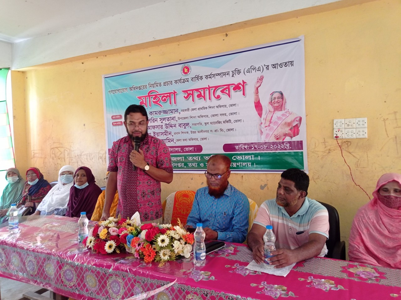হাসনাইন আহমেদ মুন্না : ভোলা জেলার উপজেলা সদরে তথ্য অফিসের আয়োজনে মহিলা সমাবেশ অনুষ্ঠিত হয়েছে। গণযোগাযোগ অধিদপ্তরের নিয়মিত প্রচার কার্যক্রম বার্ষিক কর্মসম্পাদন চুক্তি (এপিএ) এর আওতায় বুধবার বেলা সাড়ে ১১ টায় সদরের আলীনগর ইউনিয়নের ৫৪ নং উত্তর সরকারি প্রাথমিক বিদ্যালয়ের হল রুমে সভায় প্রায় ৩শত নারী উপস্থিত ছিলেন।