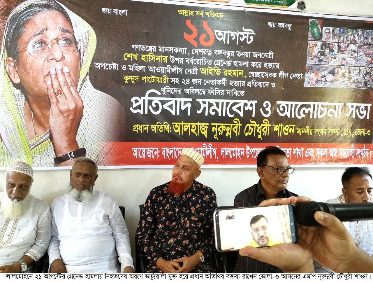 রোববার সকালে লালমোহন উপজেলা আওয়ামী লীগের আয়োজনে ২১ আগস্টের গ্রেনেড হামলায় নিহতদের স্মরণে আলোচনা সভায় ভার্চ্যুয়ালী যুক্ত হয়ে প্রধান অতিথির বক্তব্যে এ মন্তব্য করেন তিনি। এছাড়াও ২১ আগস্টের হামলা মামলার রায় দ্রæত কার্যকর করে দোষীদের দৃষ্টান্তমূলক শাস্তির দাবি করেছেন সংসদ সদস্য নূরুন্নবী চৌধুরী শাওন। পরে গ্রেনেড হামলায় নিহতদের রুহের মাগফেরাত কামনায় দোয়া মোনাজাত অনুষ্ঠিত হয়।