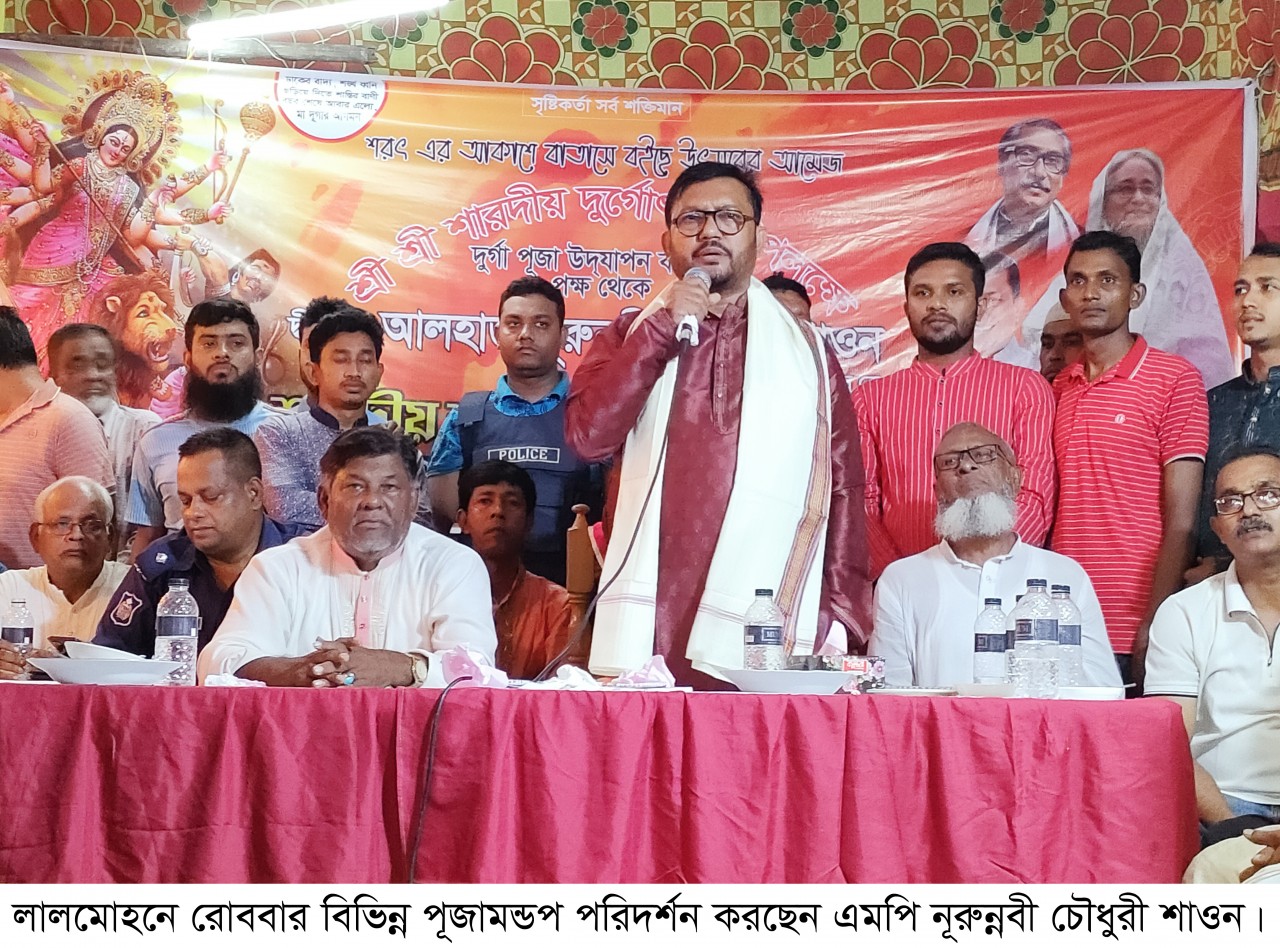 তিনি আরও বলেন, দুর্গাপূজা সার্বজনীন উৎসব। জাতির পিতা বঙ্গবন্ধু শেখ মুজিবুর রহমানের সুযোগ্য কন্যা প্রধানমন্ত্রী শেখ হাসিনার যোগ্য নেতৃত্বে স¤প্রীতির এই বন্ধন আরও সুদৃঢ় হয়েছে। এসময় উপস্থিত ছিলেন, লালমোহন উপজেলা চেয়ারম্যান অধ্যক্ষ গিয়াস উদ্দিন আহমেদ, উপজেলা আওয়ামী লীগের সাধারণ সম্পাদক ফখরুল আলম হাওলাদার, যুগ্ম সাধারণ সম্পাদক আনোয়ারুল ইসলাম রিপন ও হিন্দু স¤প্রদায়ের প্রতিনিধিদল সহ আরো অনেকে।