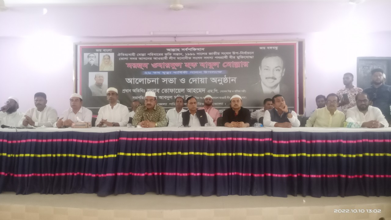ভোলা জেলা আওয়ামী লীগের সিনিয়র সহ-সভাপতি ও জেলা পরিষদের চেয়ারম্যান আব্দুল মমিন টুলুর সভাপতিত্বে আলোচনা ও দোয়া অনুষ্ঠানে বক্তব্য রাখেন, জেলা আওয়ামী লীগের সাবেক যুগ্ম সাধারণ সম্পাদক জহুরুল ইসলাম নকিব, সাবেক যুগ্ম সাধারণ সম্পাদক এনামুল হক আরজু, জেলা মুক্তিযোদ্ধা সংসদের সাবেক ডেপুটি কমান্ডার শফিকুল ইসলাম, সদর উপজেলা পরিষদের ভাইস চেয়ারম্যান মোঃ ইউনুছ, কাউন্সিলর মো. শাহে আলম, ভোলা পৌর আওয়ামী লীগের সম্পাদক শাহ আলী নেওয়াজ পলাশ প্রমূখ। পরে দোয়া মোনাজাত করা করা হয়। উল্লেখ ১৯৯৬ সালের ১০ অক্টোবর ঢাকার পল্লবীতে নিজ অফিসের সামনে বাবুল মোল্লাকে গুলি করে হত্যা করা হয়।