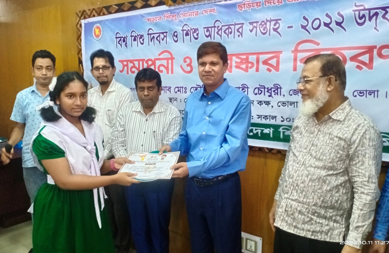 অতিরিক্ত জেলা প্রশাসক সার্বিক বিবেক সরকারের সভাপতিত্বে সভায় বক্তব্য রাখেন, ভোলা জেলা সমাজসেবা কার্যালয়ের উপ-পরিচালক মো: নজরুল ইসলাম, সাবেক অধ্যক্ষ রুহুল আমিন জাহাঙ্গির, জেলা তথ্য অফিসার মো: নুরুল আমিন, জেলা শিশু বিষয়ক কর্মকর্তা মো: আখতার হোসেন, আবৃত্তি প্রশিক্ষক মশিউর রহমান পিংকু। শিশুদের মধ্যে বক্তব্য রাখেন, ভোলা সরকারি বালিকা উচ্চ বিদ্যালয়ের চতুর্থ শ্রেণীর ছাত্রী সিয়েনা তাসকিয়া, শিক্ষার্থী জায়মা জাহান ও নিশাত ফারজানা। এসময় প্রধান অতিথি তার বক্তব্যে বলেন, আগামীতে আমরা থাকবো না এ শিশুরাই আমাদের স্থান নিবে। তাই তাদের ছোট বেলা থেকেই মেধা মননে বড় করে তুলতে হবে। তাকে শিক্ষিত করার পাশাপাশি ভালো মানুষ বানাতে হবে,মানবিক বানাতে হবে। তাদের চিন্তা চেতনাকে বিকশিত করতে খেলাখুলা,সাংস্কৃতিক চর্চার বিকল্প নেই। তিনি অভিভাবকদের প্রতি আহ্বান জানান শিশুদের খেলাখুলা সহ সাংস্কৃতিক চর্চায় আগ্রহী করে তুলতে। অনুষ্ঠানে আলোচনা সভার পাশাপাশি ও কবিতা আবৃত্তি করেন সিয়েনা তাসকিয়া। পরে সপ্তাহ ব্যাপী গান,চিত্রাঙ্কন, উপস্থিত বক্তৃতা,রচনাসহ বিভিন্ন প্রতিযোগীতায় প্রায় ৩ শত প্রতিযোগী মধ্যে বিজয়ী শিশুদের হাতে জেলা প্রশাসক মো: তৌফিক ই-লাহী চৌধুরী সনদ ও পুরুস্কার তুলে দেন। উল্লেখ্য, গত ৩ অক্টোবর বিশ্ব শিশু দিবস ও শিশু অধিকার সপ্তাহের কর্মসূচি শুরু হয়।