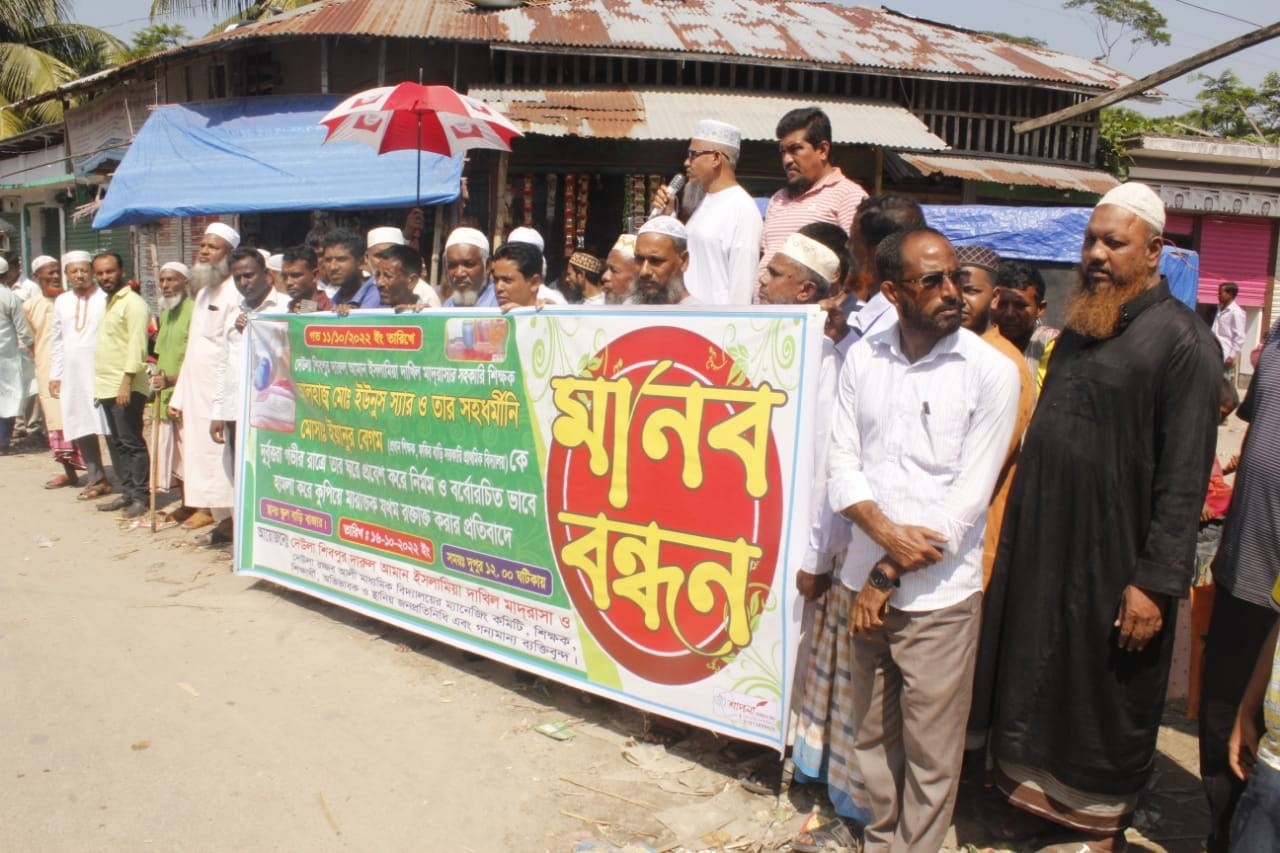 বোরহানউদ্দিন প্রতিনিধি : ভোলার বোরহানউদ্দিন উপজেলার দেউলা শিবপুর দারুল আমান ইসলামীয়া দাখিল মাদ্রাসার সিনিয়র শিক্ষক আলহাজ্ব মোঃ ইউনুস (৫৭) ও তার স্ত্রী ফকির বাড়ি সরকারি প্রাথমিক বিদ্যালয়ের প্রধান শিক্ষিকা ইয়ানুর বেগম ( ৫০) কে রাতের অন্ধকারে হত্যার উদ্দেশ্য বর্বর হামলা ও কুপিয়ে জখম করার প্রতিবাদে মানব বন্ধন ও বিক্ষোভ করেছেন শিক্ষার্থী,শিক্ষক ও এলাকাবাসী। বরিবার সকাল ১১.৩০ মিনিটের দিকে বোরহান উদ্দিন উপজেলার সাচরা ইউনিয়নের স্কুল বাড়ি এলাকার দেউলা রজ্জব আলি মাধ্যমিক বিদ্যালয়ের সামনে এই মানববন্ধন কর্মসূচি অনুষ্ঠিত হয়। দেউলা শিবপুর দারুল আমান ইসলামীয়া দাখিল মাদ্রাসার ম্যানেজিং কমিটির সদস্য মোঃ জাকির হোসেন মেম্বারের সভাপতিত্বে এই মানববন্ধনে শুরুতে বক্তব্য রাখেন দেউলা শিবপুর দারুল আমান ইসলামীয়া দাখিল মাদ্রাসার সুপার মাওলানা একেএম ইদ্রিস। প্রধান অতিথি হিসেবে বক্তব্য রাখেন বোরহান উদ্দিন কামিল মাদ্রাসার অধ্যক্ষ ও জামিয়াতুল মোদাররেসিন বোরহানউদ্দিন উপজেলার সভাপতি মাওঃ এবিএম আহমদুল্লাহ আনসারি। এসময় আরো বক্তব্য রাখেন জয়া মহিলা আলিম মাদ্রাসার অধ্যক্ষ মাওঃ আবদুল গনি, হাজির হাট ইসলামিয়া দাখিল মাদ্রাসার সুপার মাওঃ মোঃ ইউসুফ, মজমের হাট ফাজিল মাদ্রাসার ভারপ্রাপ্ত অধ্যক্ষ মোঃ মনিরুল ইসলাম, দেউলা শিবপুর সলেমা খানম বালিকা দাখিল মাদ্রাসার সুপার মাওলানা হারুনর রশীদ, রজ্জব আলি মাধ্যমিক বিদ্যালয়ের প্রধান শিক্ষিক মোঃ মোস্তফা কুদ্দুস, সহকারী শিক্ষক মাওঃ মোস্তফা কামাল, তালুকদার বাড়ি মাধ্যমিক বিদ্যালয়ের প্রধান শিক্ষিক মোঃ কামাল হোসেন ও ধর্মিয় শিক্ষক মাওঃ রফিকুল ইসলাম, সাচরা ইউনিয়ন স্বাস্থ্য সহকারী মোঃ মাইনুদ্দিন প্রমুখ।