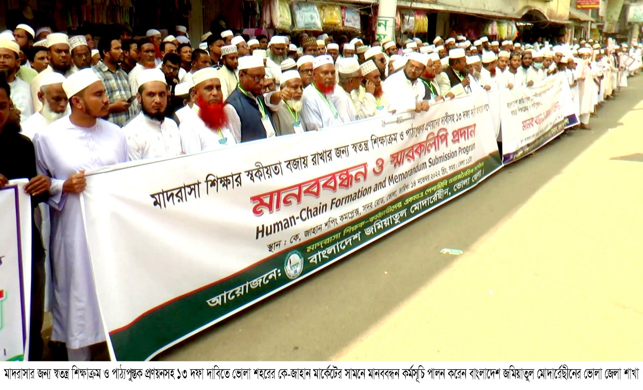 বাংলার কণ্ঠ প্রতিবেদক : মাদরাসার জন্য স্বতন্ত্র শিক্ষাক্রম ও পাঠ্যপুস্তক প্রণয়নসহ ১৩ দফা দাবী আদায়ের লক্ষ্যে ভোলায় মানববন্ধন কর্মসূচি পালন করা হয়েছে। সোমবার বেলা ১১টার দিকে বাংলাদেশ জমিয়াতুল মোদার্রেছীনের ভোলা জেলা শাখার আয়োজনে শহরের কে-জাহান মার্কেটের সামনে ঘন্টাব্যাপী এ মানববন্ধন কর্মসূচি পালন করা হয়। মানববন্ধনে জেলার বিভিন্ন মাদরাসার প্রায় সহ¯্রাধিক শিক্ষক ও ছাত্র অংশগ্রহন করেন।