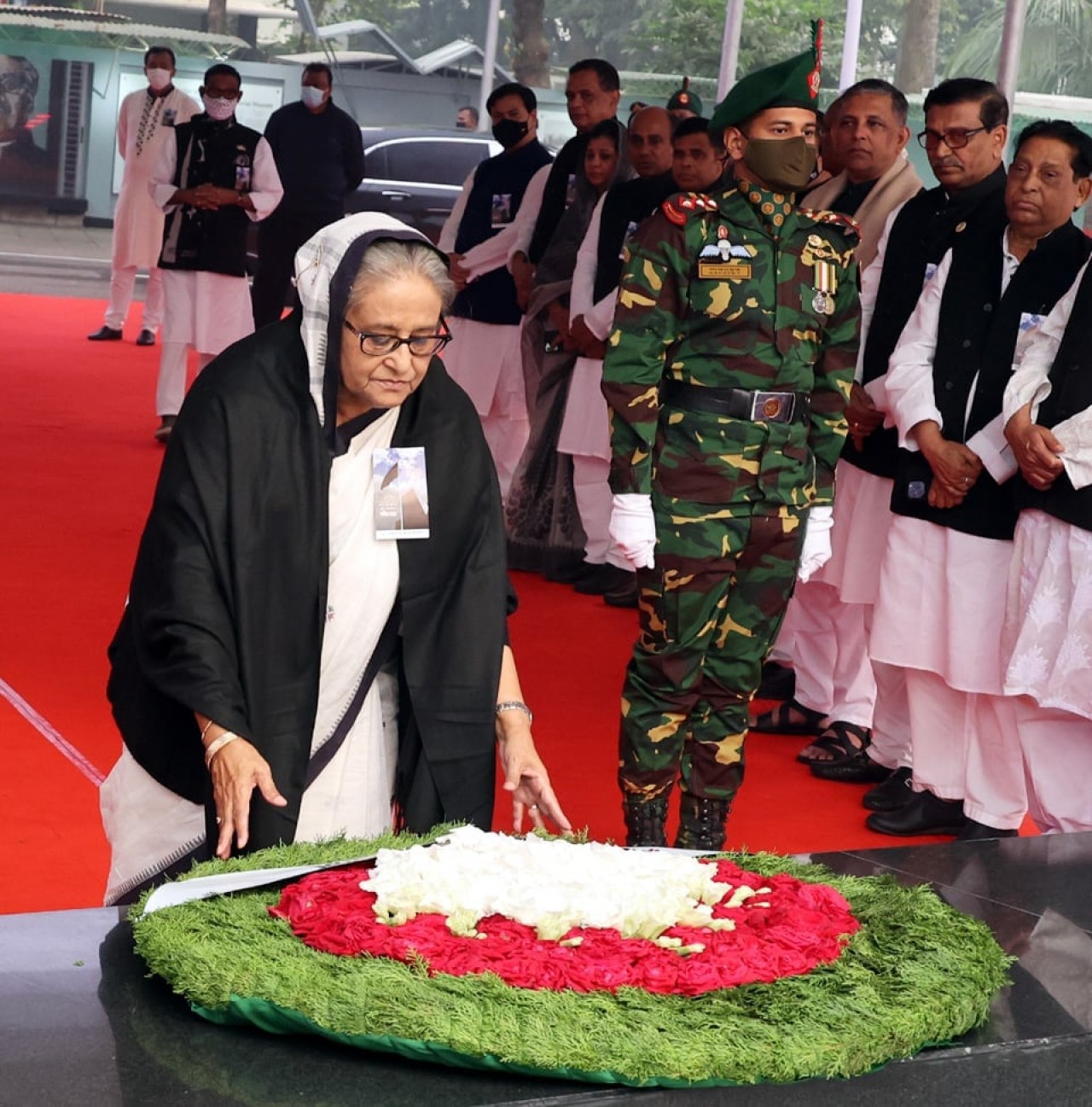 দলীয় নেতৃবৃন্দকে সঙ্গে নিয়ে আওয়ামী লীগ সভাপতি হিসেবে শেখ হাসিনা জাতির পিতার প্রতিকৃতিতে আরেকটি পুষ্পস্তবত অর্পণ করেন।