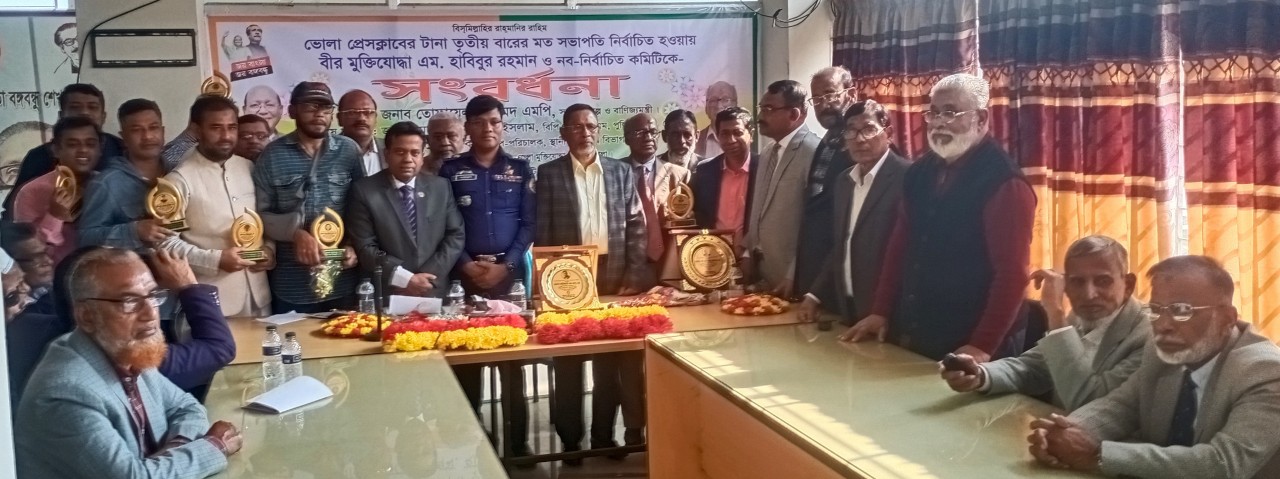 বাংলার কণ্ঠ প্রতিবেদক : মুক্তিযুদ্ধ চলাকালীন সাংবাদিকতায় বিশেষ অবদান রাখাসহ টানা তৃতীয়বারের মতো ভোলা প্রেসক্লাবের সভাপতি নির্বাচিত হওয়ায় প্রবীণ সাংবাদিক বীর মুক্তিযোদ্ধা এম. হাবিবুর রহমানকে সংবর্ধনা জানিয়েছে ভোলার মুক্তিযোদ্ধা সংসদ। মঙ্গলবার দুপুরে সদর উপজেলা মুক্তিযোদ্ধা সংসদের হলরুমে এই সংবর্ধনা সভা অনুষ্ঠিত হয়। একই সাথে সংবর্ধনা দেয়া হয় প্রেসক্লাবের নব নির্বাচিত কার্যনির্বাহী কমিটির সদস্যদেরকে। অনুষ্ঠানের প্রধান অতিথি আওয়ামী লীগের উপদেষ্টা পরিষদের সদস্য, ভোলা-১ আসনের সংসদ সদস্য ও সাবেক মন্ত্রী তোফায়েল আহমেদ ঢাকা থেকে এক বার্তায় সকলকে অভিনন্দন ও শুভেচ্ছা জানান।