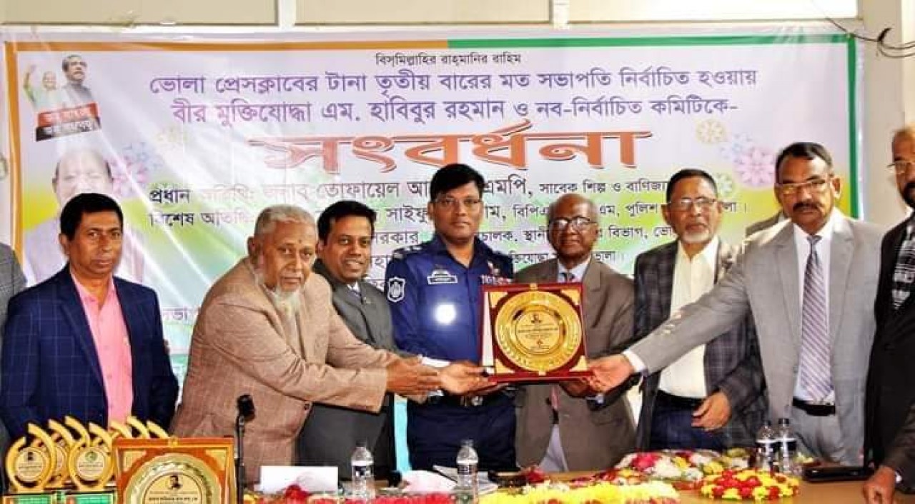 সভা শেষে ভোলা প্রেসক্লাবের সভাপতি বীর মুক্তিযোদ্ধা এম হাবিবুর রহমান এবং সাধারণ সম্পাদক অমিতাভ অপুসহ কমিটির নির্বাচিত সদস্যদের হাতে সম্মাননা স্মারক তুলে দেয়া হয়।