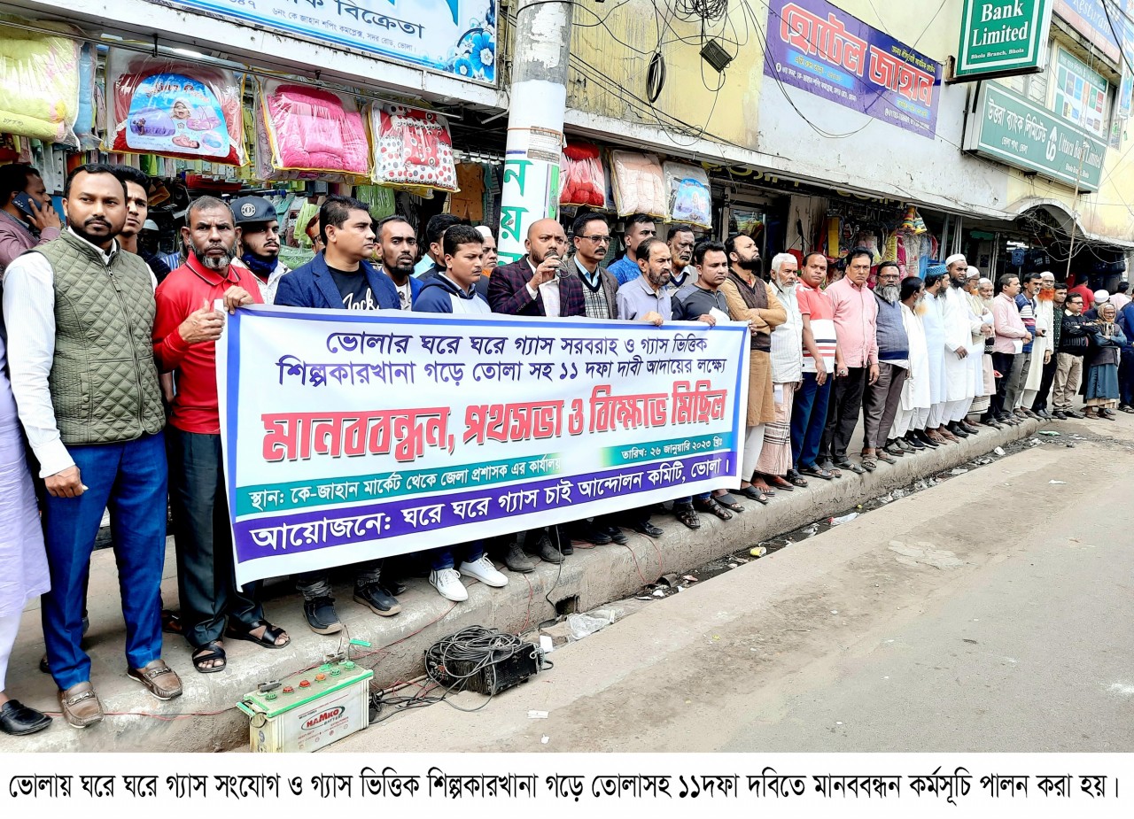 এ সময় বক্তারা বলেন, ভোলায় একের পর এক গ্যাসক্ষেত্রের সন্ধান পাওয়া যাচ্ছে ও গ্যাসও উত্তোলন হচ্ছে। কিন্তু এখনও ভোলার ঘরে ঘরে গ্যাস পৌঁছেনি। ভোলায় মাত্র ২ হাজার ৩৫০ টি পরিবারকে গ্যাসের সংযোগ দেওয়া হয়েছে। তাই আমরা ভোলার প্রতিটি ঘরে ঘরে গ্যাস সংযোগ দেওয়া ও ভোলার গ্যাস ভিত্তিক শিল্পকারখানা গড়ে তোলার পর ভোলার গ্যাস অন্যত্রে নেয়ার জন্য সরকারের কাছে দাবী জানাচ্ছি। তারা আরো বলেন,বর্তমানে ভোলাবাসীকে গ্যাস না দিয়ে ভোলার গ্যাস অন্যত্র নেওয়ার সরকারের সিদ্ধান্ত হয়। আমাদের দাবী সরকারের পূর্ব সিদ্ধান্ত অনুযায়ী ঘরে ঘরে গ্যাস দেয়াসহ ভোলায় গ্যাস ভিত্তিক শিল্প কারখানা গড়ে তুলতে হবে। তারপর অন্যত্র গ্যাস নেয়ার দাবি করেন তারা।
