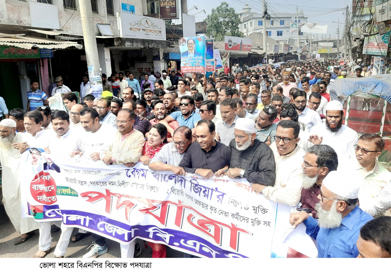 বাংলার কণ্ঠ প্রতিবেদক: কোন অপ্রীতিকর ঘটনা ছাড়াই ভোলায় শান্তিপূর্ন ভাবে বিএনপি পদযাত্রাসহ বিক্ষোভ মিছিল করেছে। শনিবার সকালে কেন্দ্রীয় কর্মসূচীর অংশ হিসাবে ১০ দফা দাবীতে ভোলা শহরে বিএনপির নেতাকর্মীরা পদযাত্রা বের করে বিক্ষোভ মিছিল ও প্রতিবাদ সমাবেশ করেছে। বেলা ১২ টার দিকে মহাজনপট্রি এলাকা থেকে বিএনপির একটি বিক্ষোভ মিছিল বের করে। মিছিলটি বরিশাল দালান এলাকায় গেলে পুলিশের বাধার মুখে পরে সেখানে সংক্ষিপ্ত প্রতিবাদ সমাবেশ করে সরকার বিরোধী ¯েøাগান দেয়। পরে বিএনপির নেতাকর্মীরা দলীয় কার্যালয়ে ফিরে যায়। এর আগে বেলা ১১টার দিকে জেলা বিএনপি কার্যালয়ের সামনে প্রতিবাদ সমাবেশে জেলা বিএনপির আহবায়ক আলহাজ্ব গোলাম নবী আলমগীরের সভাপতিত্বে প্রধান অতিথির বক্তব্য রাখেন, কেন্দ্রীয় বিএনপির আইন বিষয়ক সম্পাদক ব্যারিস্টার কায়সার কামাল। আরো বক্তব্য রাখেন, জেলা বিএনপির যুগ্ম আহবায়ক শফিউর রহমান কিরন, সদস্য সচিব মো. রাইসুল আলম, সদর উপজেলা বিএনপির আহবায়ক আসিফ আলতাফ, কেন্দ্রীয় যুবদলের সহসভাপতি শহিদুল্যাহ তালুকদারসহ অন্যান্যরা। এসময় বক্তারা, চাল, ডাল, তেল, আটা, লবণ, চিনিসহ নিত্যপ্রয়োজনীয় দ্রব্য মূল্য কমাতে হবে। অবৈধ সংসদ বাতিল করে নির্দলীয় নিরপেক্ষ তত্ত¡াবধায়ক সরকারের অধীনে নির্বাচন দিতে হবে। দেশনেত্রী বেগম খালেদা জিয়াসহ গ্রেফতারকৃত সকল নেতা-কর্মীদের মুক্তি, তারেক রহমানসহ নেতা-কর্মীদের নামে মিথ্যা মামলা প্রত্যাহার করতে হবে।