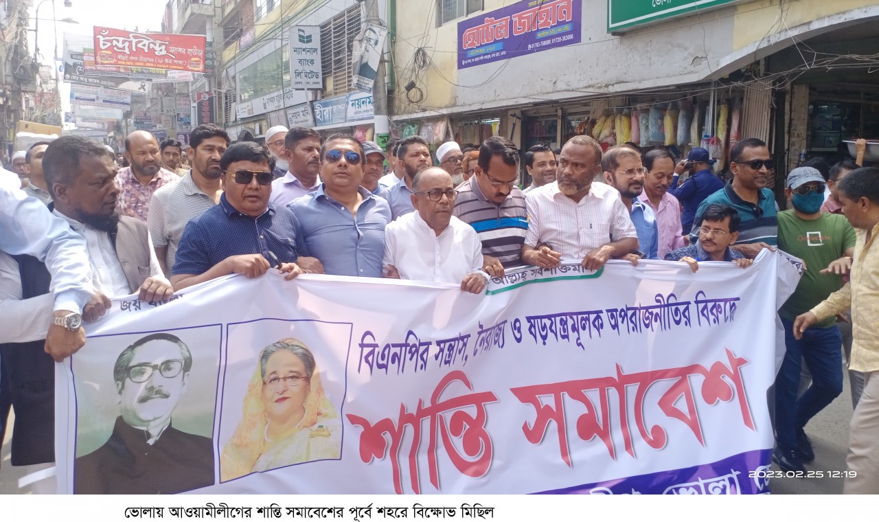 বেলা সাড়ে ১২ টার দিকে বিএনপির সন্ত্রাস নৈরাজ্য ও ষড়যন্ত্রমূলক অপরাজনীতির বিরুদ্ধে বাংলা স্কুল এলাকা থেকে শহরে একটি বিক্ষোভ মিছিল করে। পরে সদর রোডে অবসর সেন্টারের সামনে শান্তি সমাবেশ করেছে। এ সময় জেলা আওয়ামী লীগের সভাপতি ফজলুল কাদের মজনুর সভাপতিত্বে বক্তব্য রাখার পাশাপাশি উপস্থিত ছিলেন,ভোলা সদর উপজেলা আওয়ামীলীগের সাধারণ সম্পাদক নজরুল ইসলাম গোলদার, জেলা আওয়ামীলীগের সাবেক যুগ্ম সম্পাদক এনামুল হক আরজু, সাবেক সাংগঠনিক সম্পাদক বীর মুক্তিযোদ্ধা শফিকুল ইসলাম, সদর উপজেলা ভাইস চেয়ারম্যান মো: ইউনুস, সাবেক ত্রান ও সমাজ কল্যান বিষয়ক সম্পাদক সফিকুল ইসলাম,সদর উপজেলা আওয়ামী লীগের সাংগঠনিক সম্পাদক আজিজুল ইসলাম, পৌর আওয়ামী লীগের সভাপতি নজিবুল্লাহ নাজু, সম্পাদক আলী নেওয়াজ পলাশ প্রমুখ। এছাড়া যুবলীগ,সেচ্ছাসেবকলীগ,ছাত্রলীগসহ বিভিন্ন অংগসংগঠনেরনেতাকর্মীরা উপস্থিত ছিলেন। এ সময় বক্তারা, বিএনপি জামায়াত দেশে অপরাজনীতি ও ষড়যন্ত্র করছে। তাদের অপরাজনীতি বন্ধের আহবান জানিয়ে তাদের বিরুদ্ধে হুশিয়ারী উল্লেখ করে তীব্র প্রতিবাদ জানান নেতৃবৃন্দ।