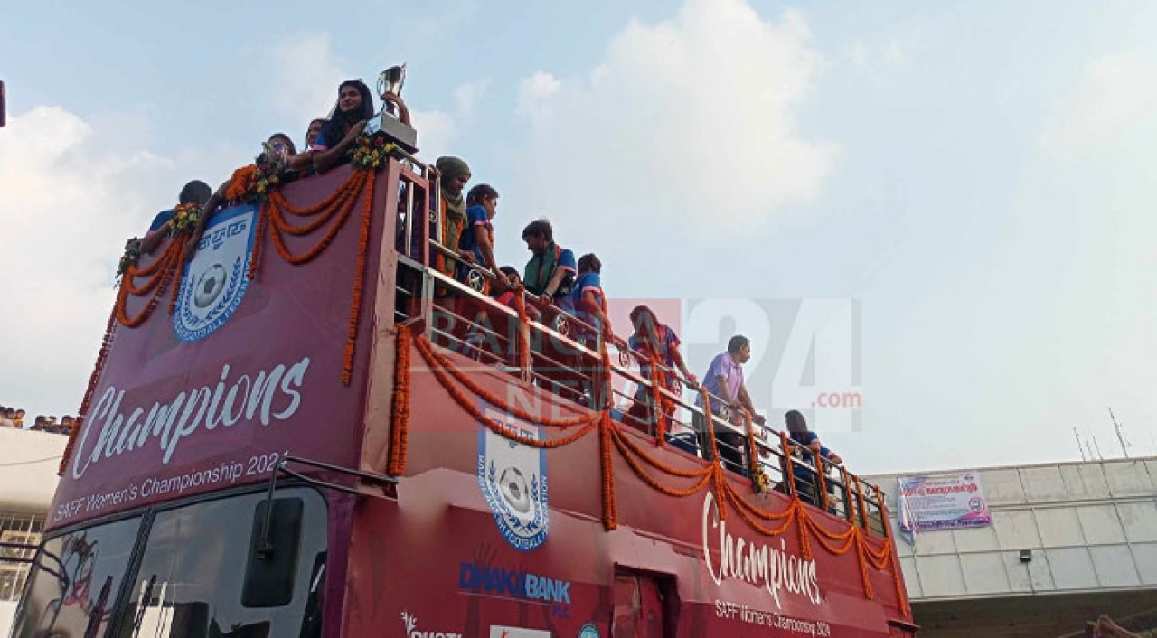 এরপর সংবাদ সম্মেলন শেষে ছাদখোলা বাসে শুরু হয় বিজয় প্যারেড। এই বাসে করে বাফুফে ভবনে যাবেন মেয়েরা।